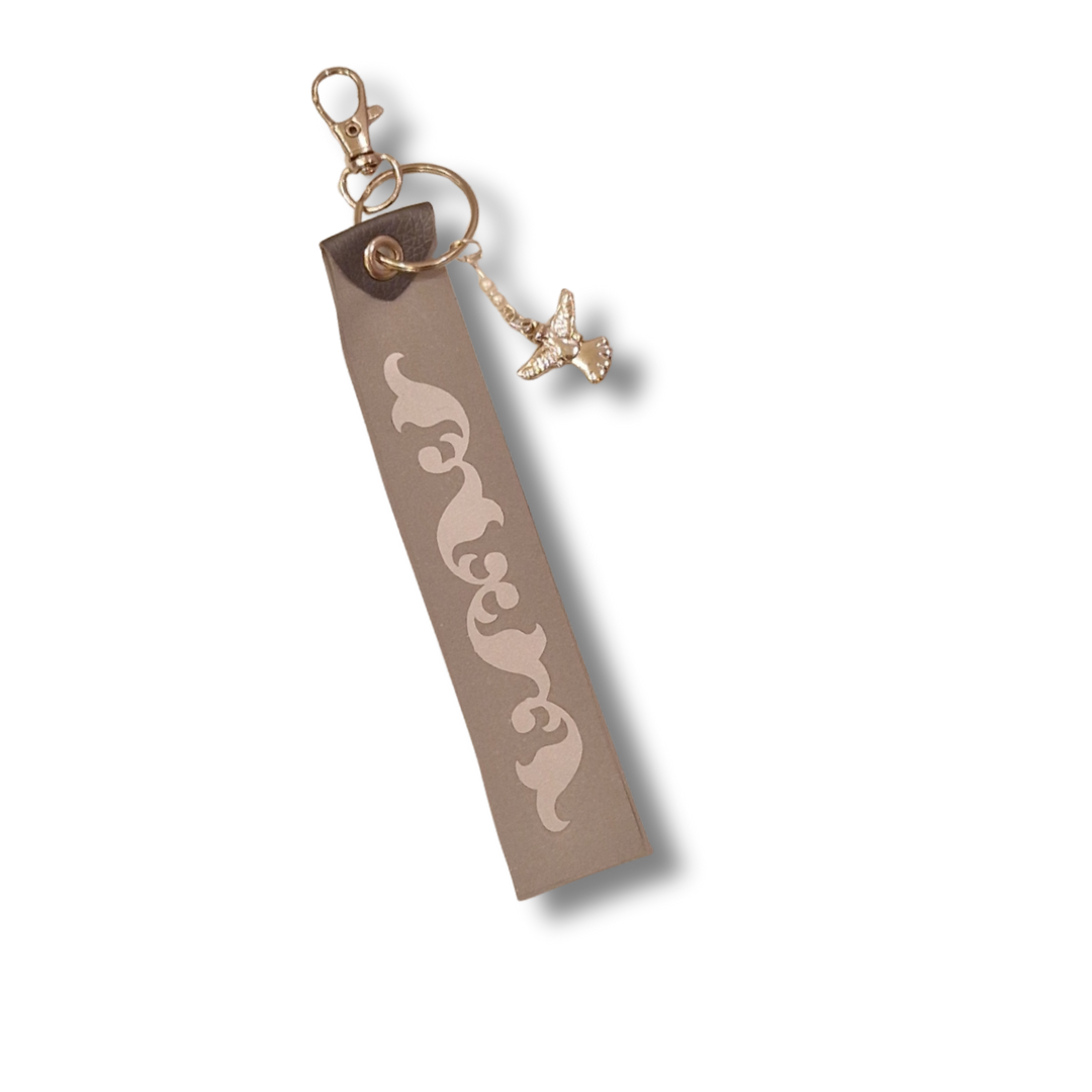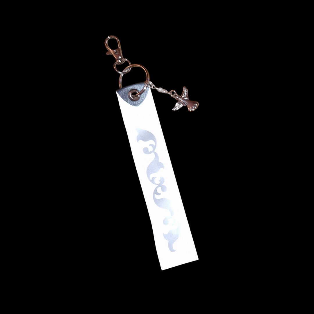 Hängande accessoar av reflextyg, ett dekorativt silverfärgat mönster samt ett litet hänge med pärlor och en ängel. Fin att hänga på handväskan!