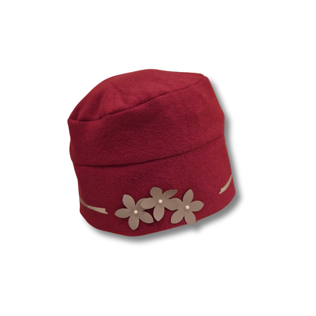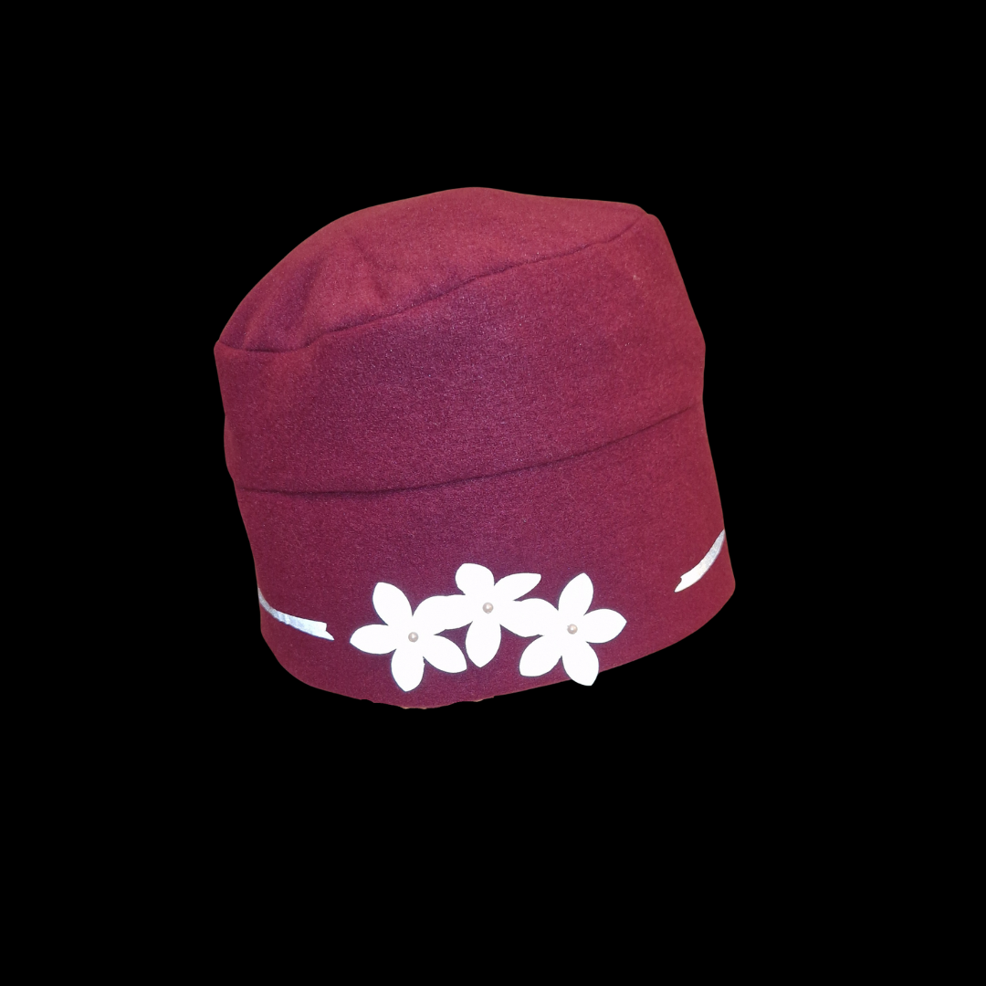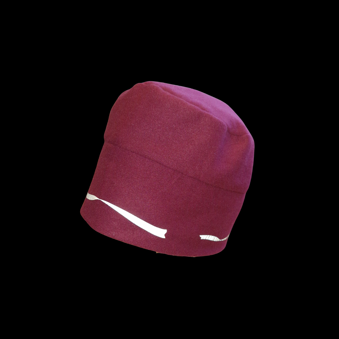 Ovanlig mössa av härligt ceriserosa fleece, dekorerad med små blommor av reflextyg samt en kant av reflexmaterial runt mössan!