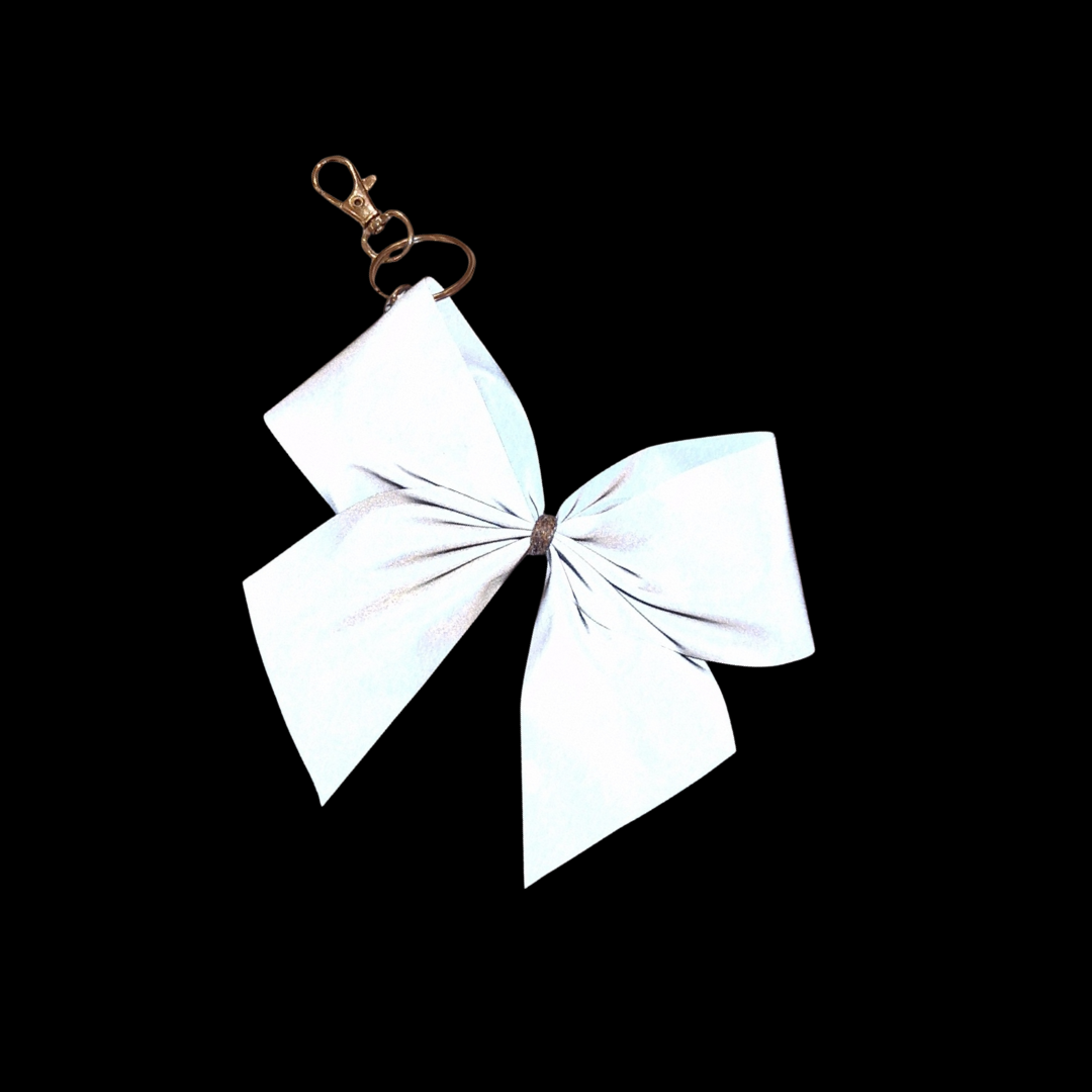 Hängande accessoar i form av en rosett helt av reflextyg. Lämpar sig för att sätta på till exempel väskan. Syns väl när det träffas av ljus i mörkret!