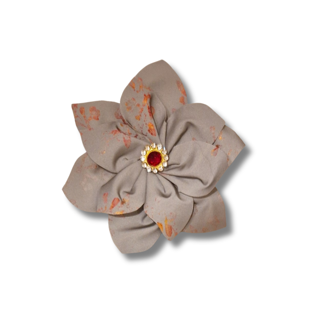 Lite extra tjusig brosch i form av en blomma av reflextyg, med ett handtryckt mönster i rött/guld. I mitten av klarröd dekorsten. Möt julen med en härlig reflexbrosch på kappan, men den funkar även fint som en vanlig brosch på klänning eller blus!