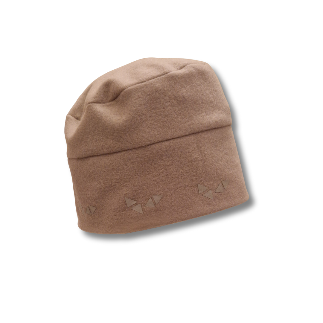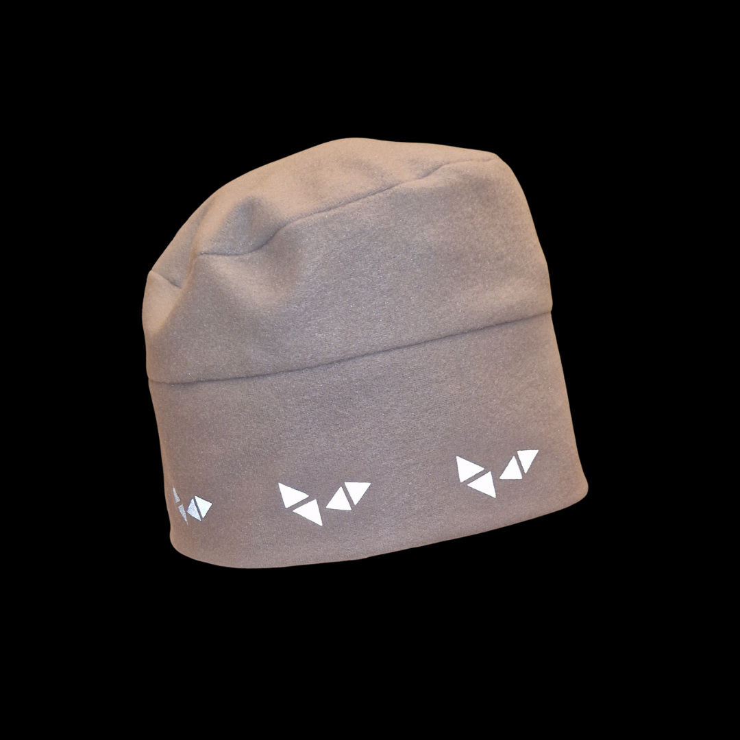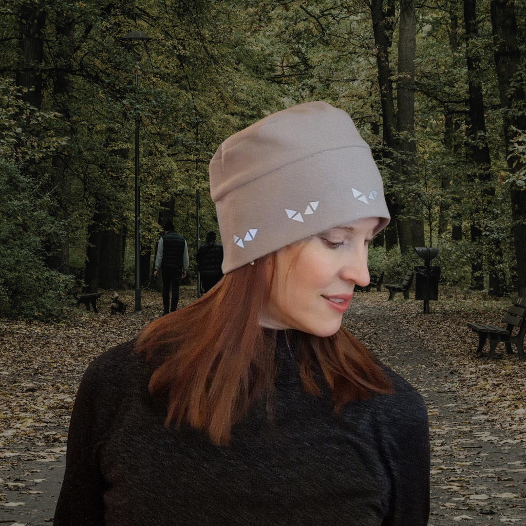 Mjuk och skön mössa av beige fleece, med ett triangel-mönster av reflexmaterial som löper runt hela mössan.