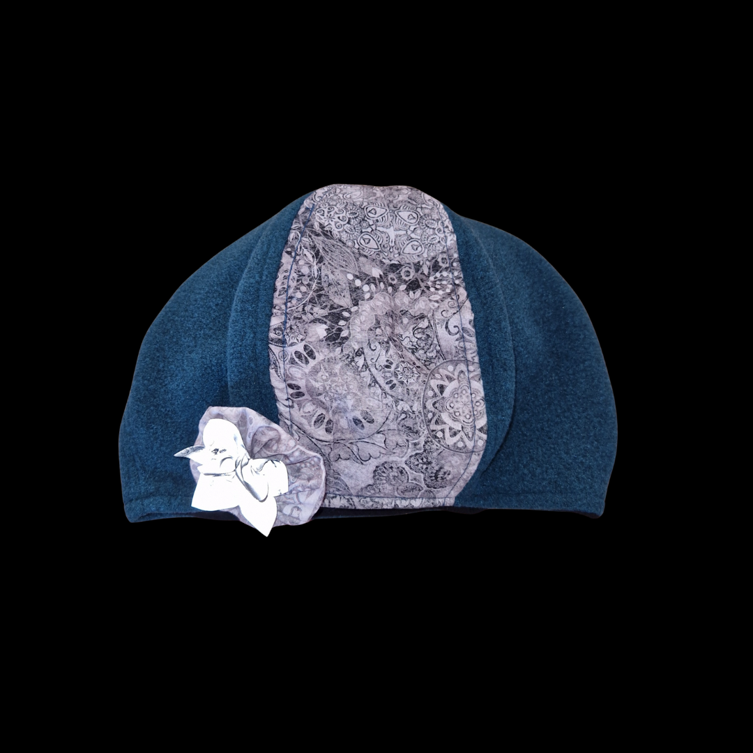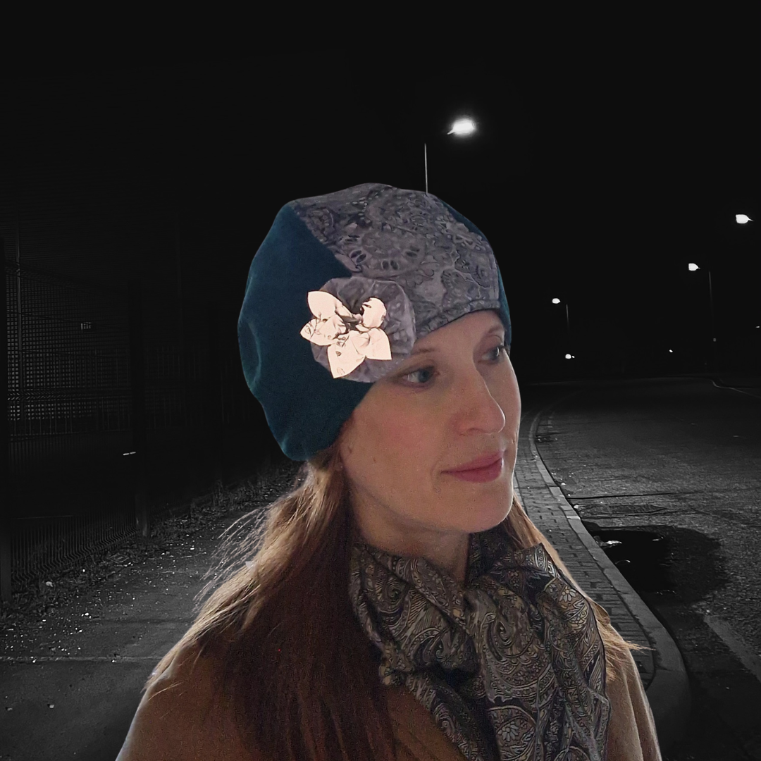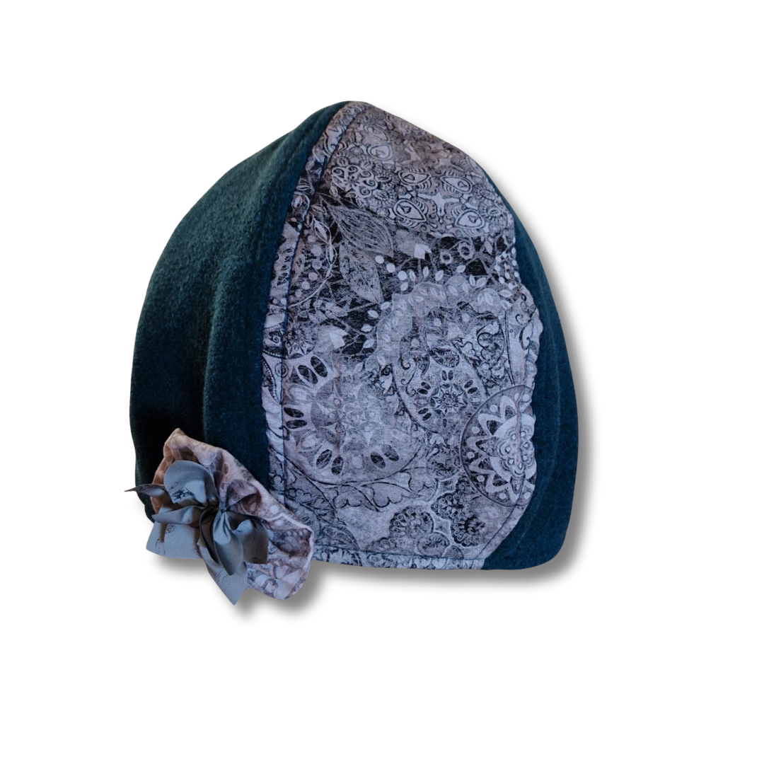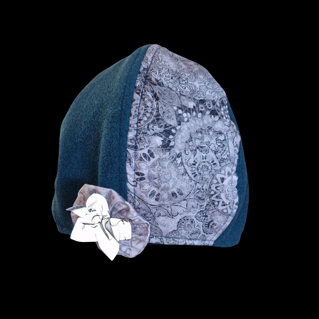 Mjuk och skön mössa av mörkgrönt fleecetyg, en bit vackert mönstrat svart-vitt tyg, samt givetvis en tillhörande reflex-brosch! Reflexbroschen är avtagbar och kan sättas även på jackan eller väskan.
