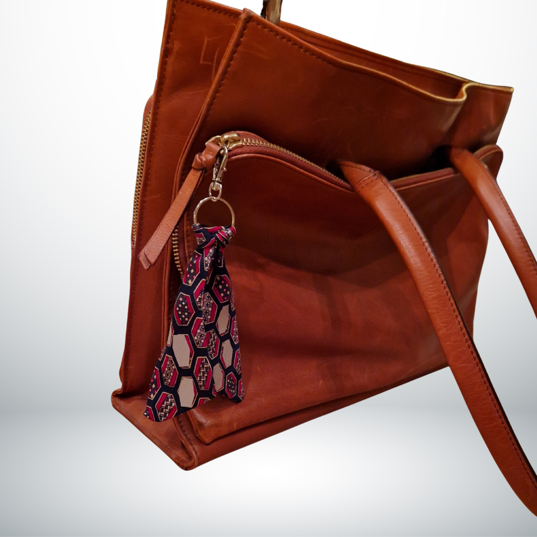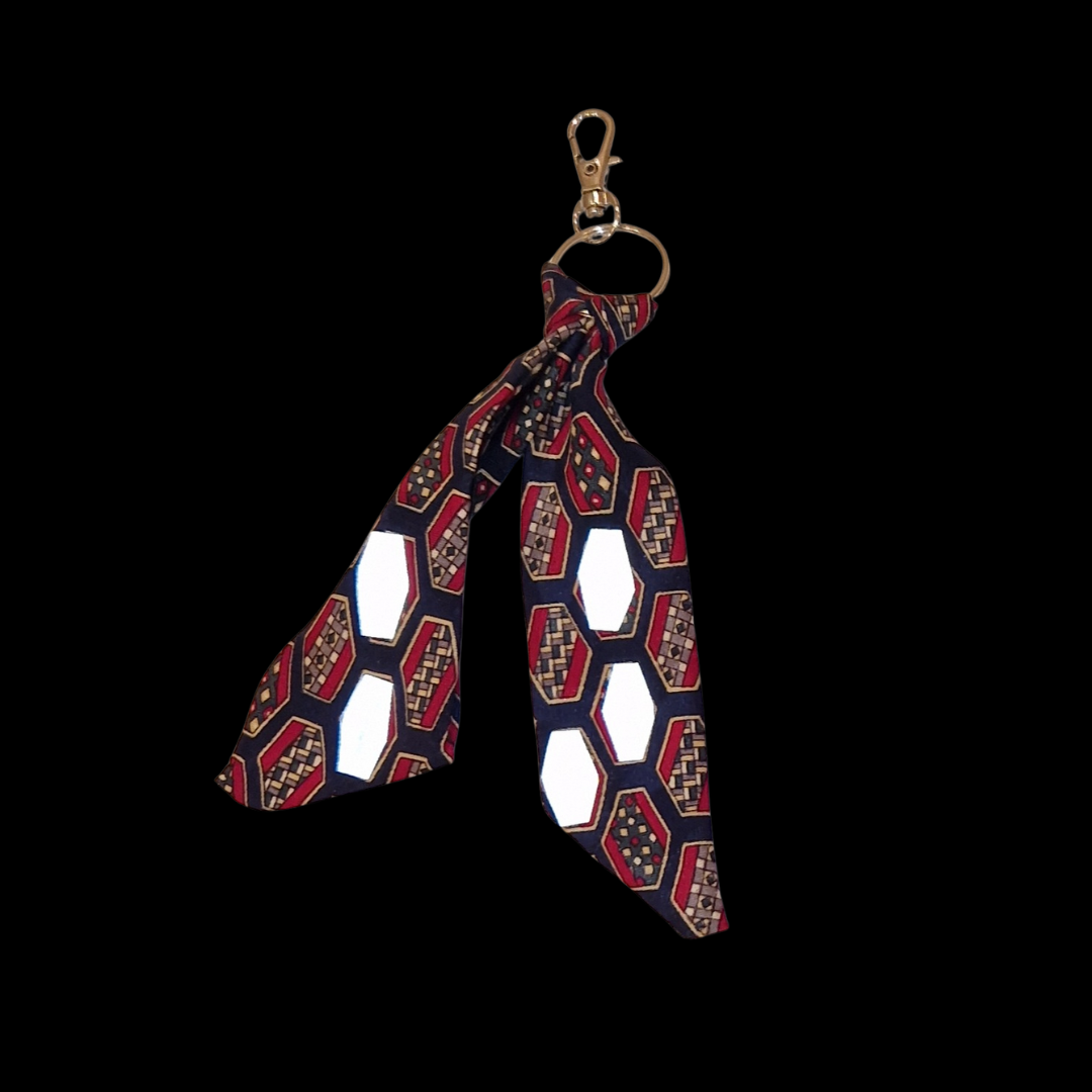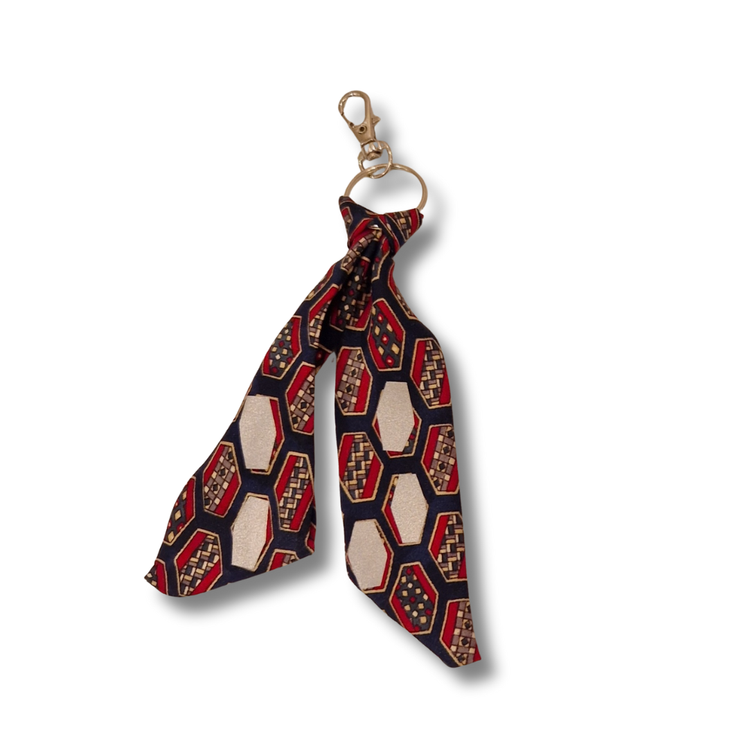 Hängande accessoar/väsksmycke tillverkad av tyg från en vacker återbrukad slips, med ett dekorativt mönster av reflexmaterial! Passar för att hänga på väskan, men tyget går även att ta loss från spännet om man hellre vill ha det till exempel i håret eller runt handleden.