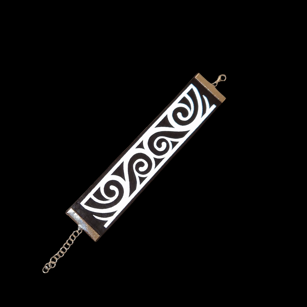 Ovanligt armband av svart äkta läder, med ett motiv av reflexvinyl! Det ser riktigt häftigt ut när det träffas av ljus även inomhus.