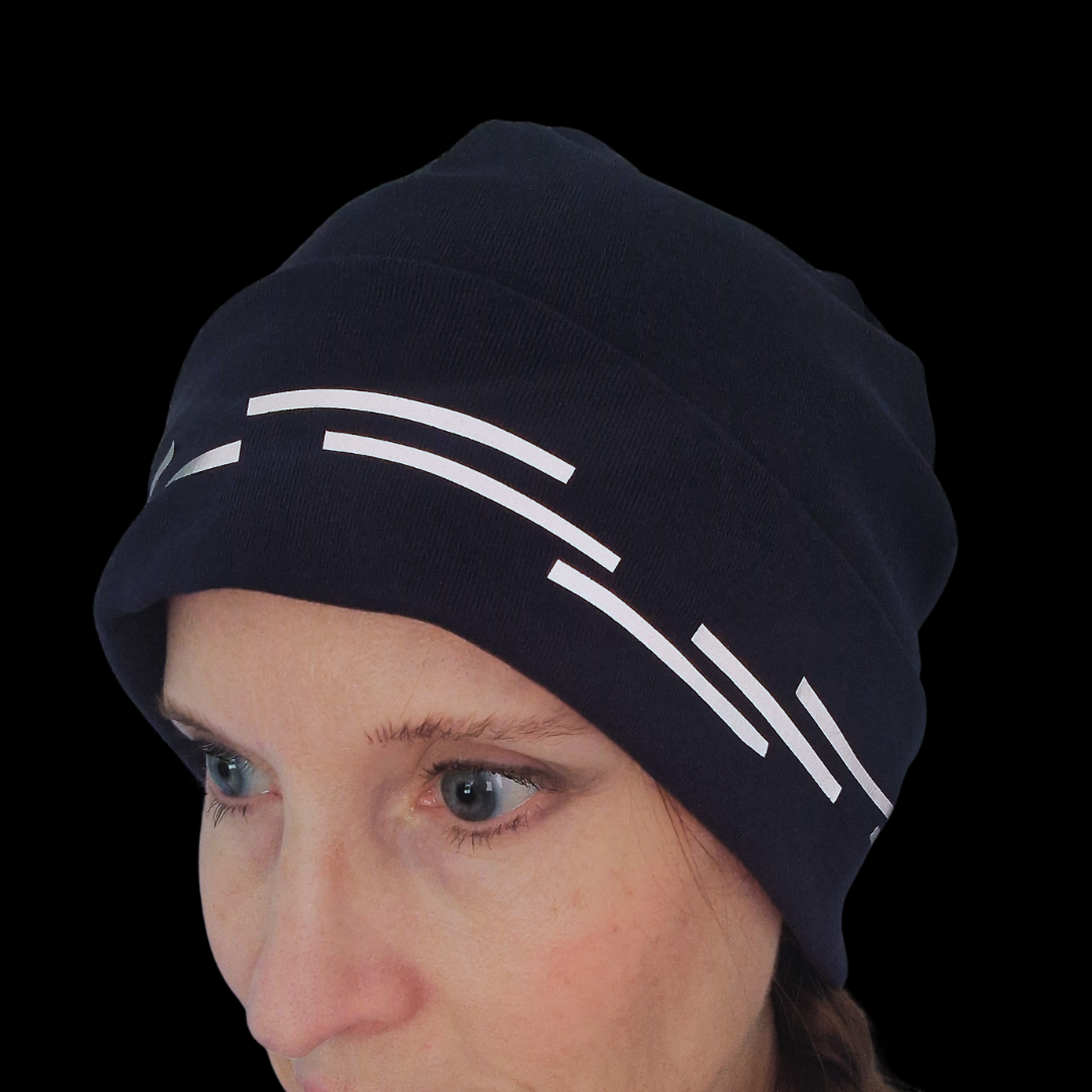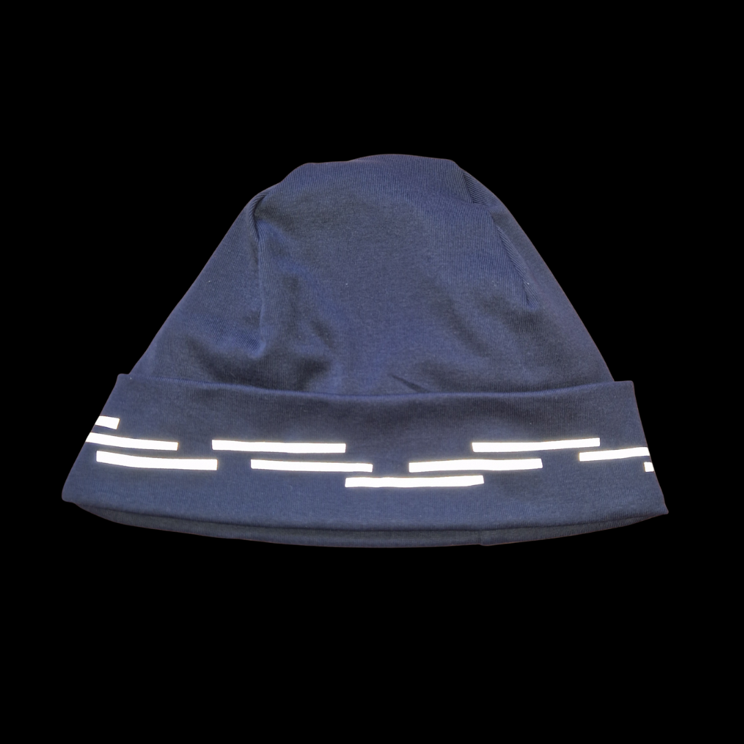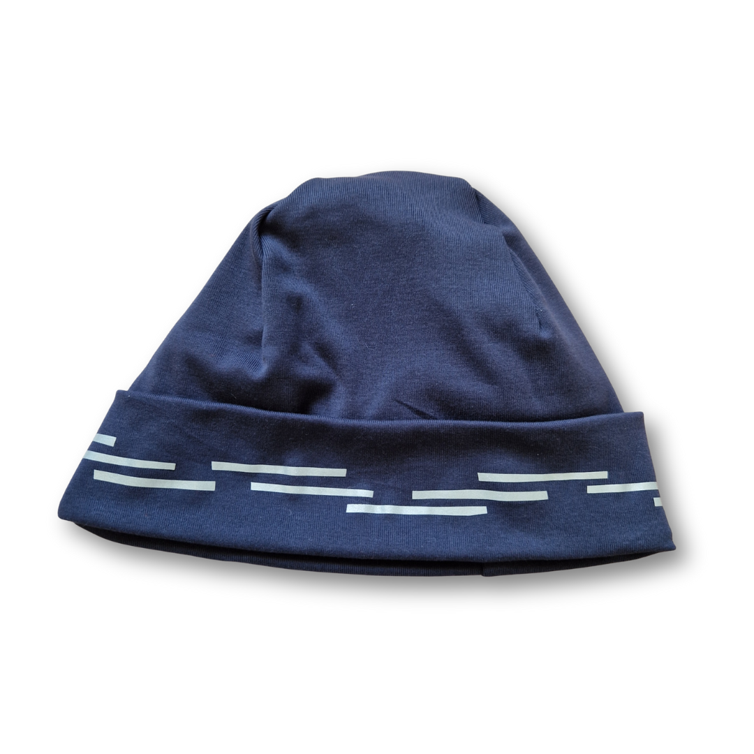 Skön mössa av mörkblå bomullstrikå, med ett dekorativt reflexmotiv runt hela kanten. Perfekt för en promenad eller joggingtur på kvällen.