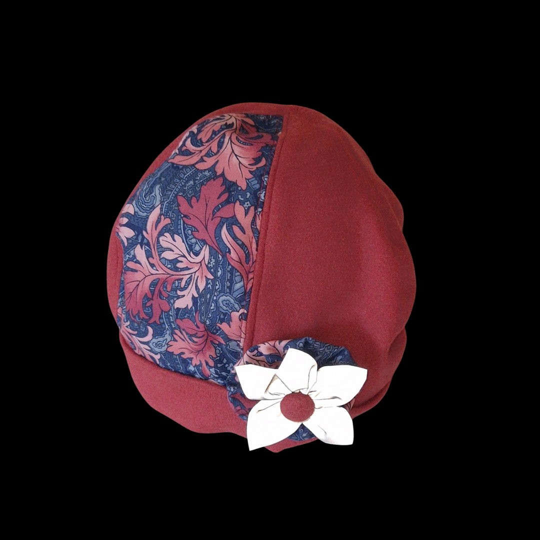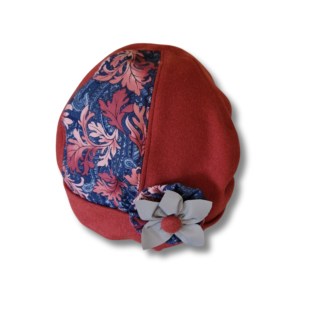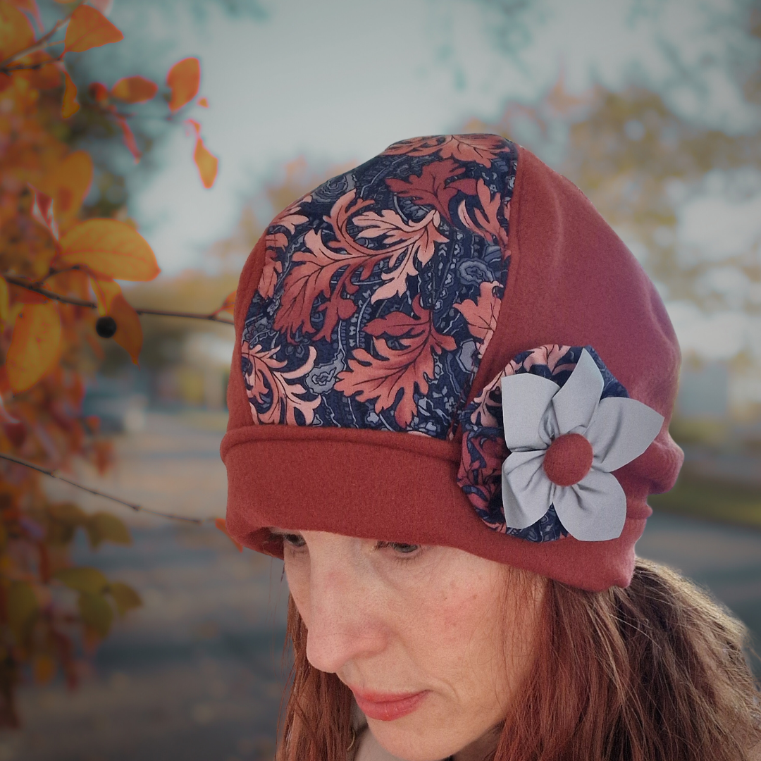 Härlig "höstig" mössa av roströd fleece, en bit vackert mönstrat tyg från vår lokala hantverksmarknad Samverket, samt givetvis en matchande reflexbrosch (avtagbar)!