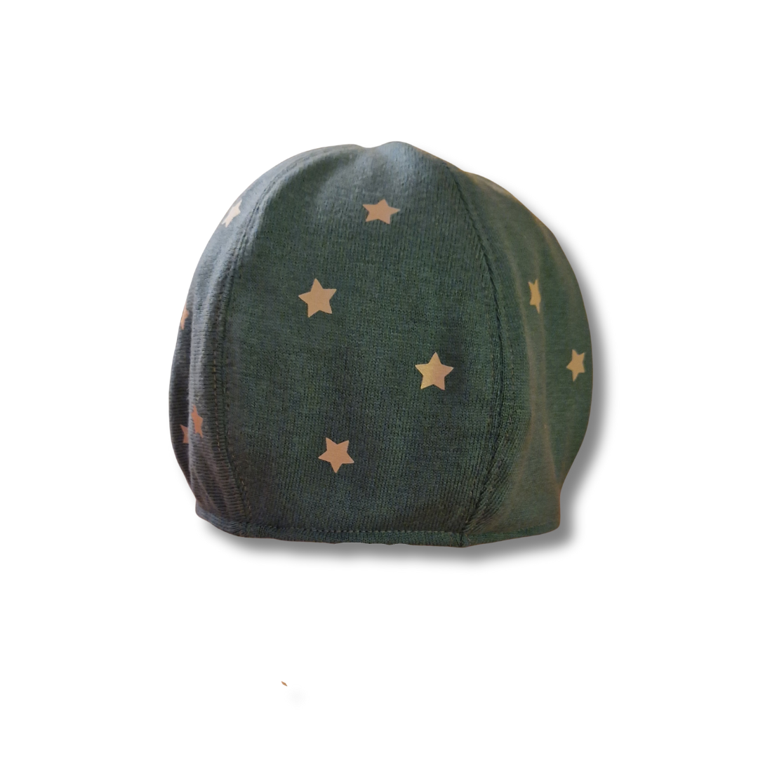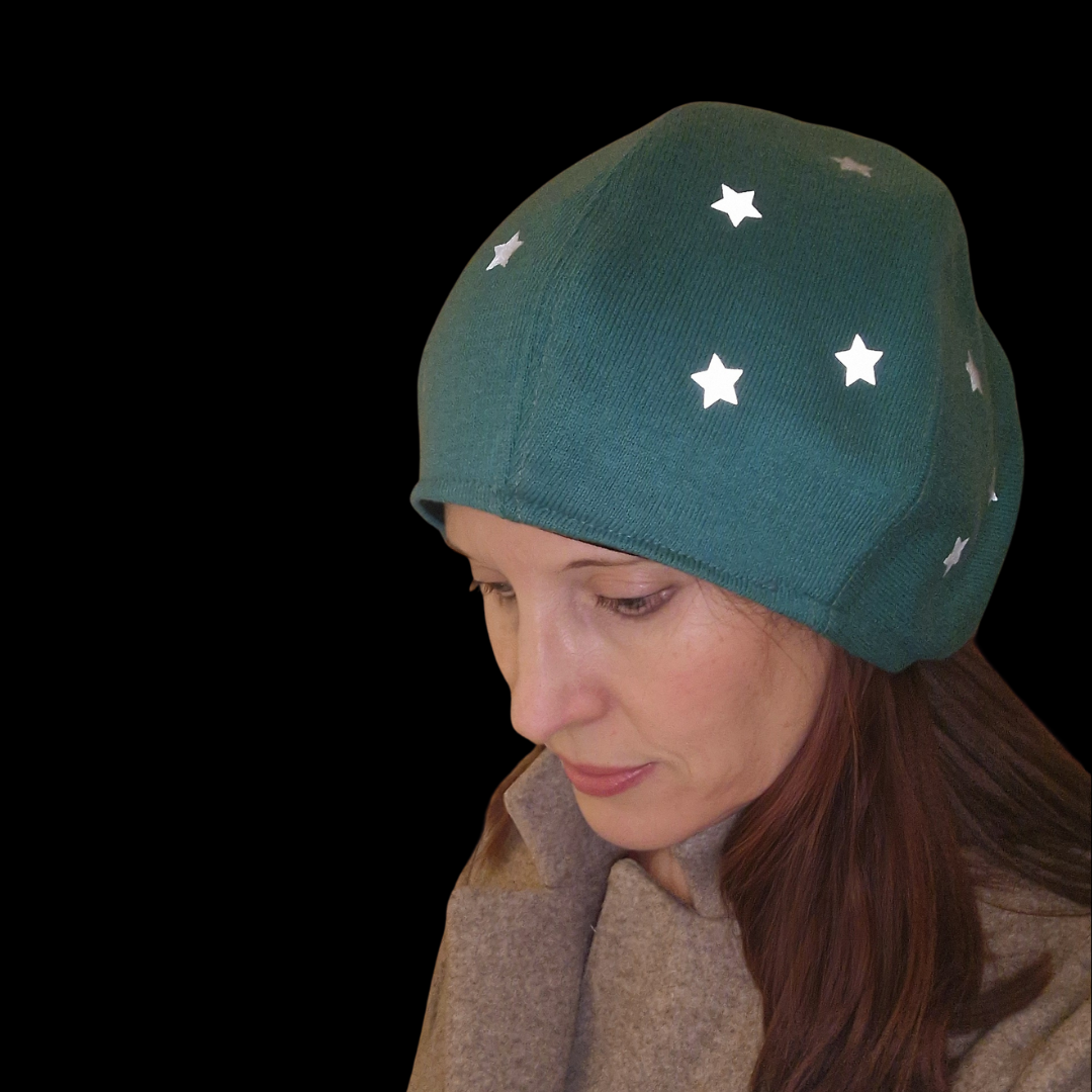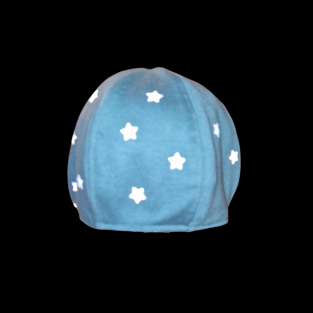 Härlig turkos-grön mössa, med mönster av små stjärnor av reflexmaterial! Både skön och praktisk i höstmörkret.